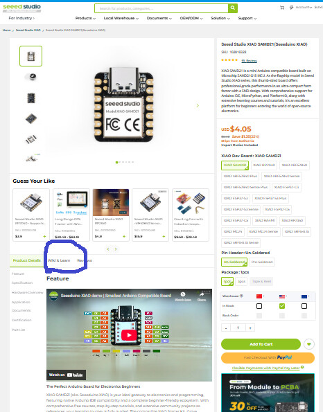 If you notice the area circled in blue :wiki and learnthis are is not immediatly noticable, but each product page will have this tab that will lead to links to seeed and other webpages with information regarding the device of the product page