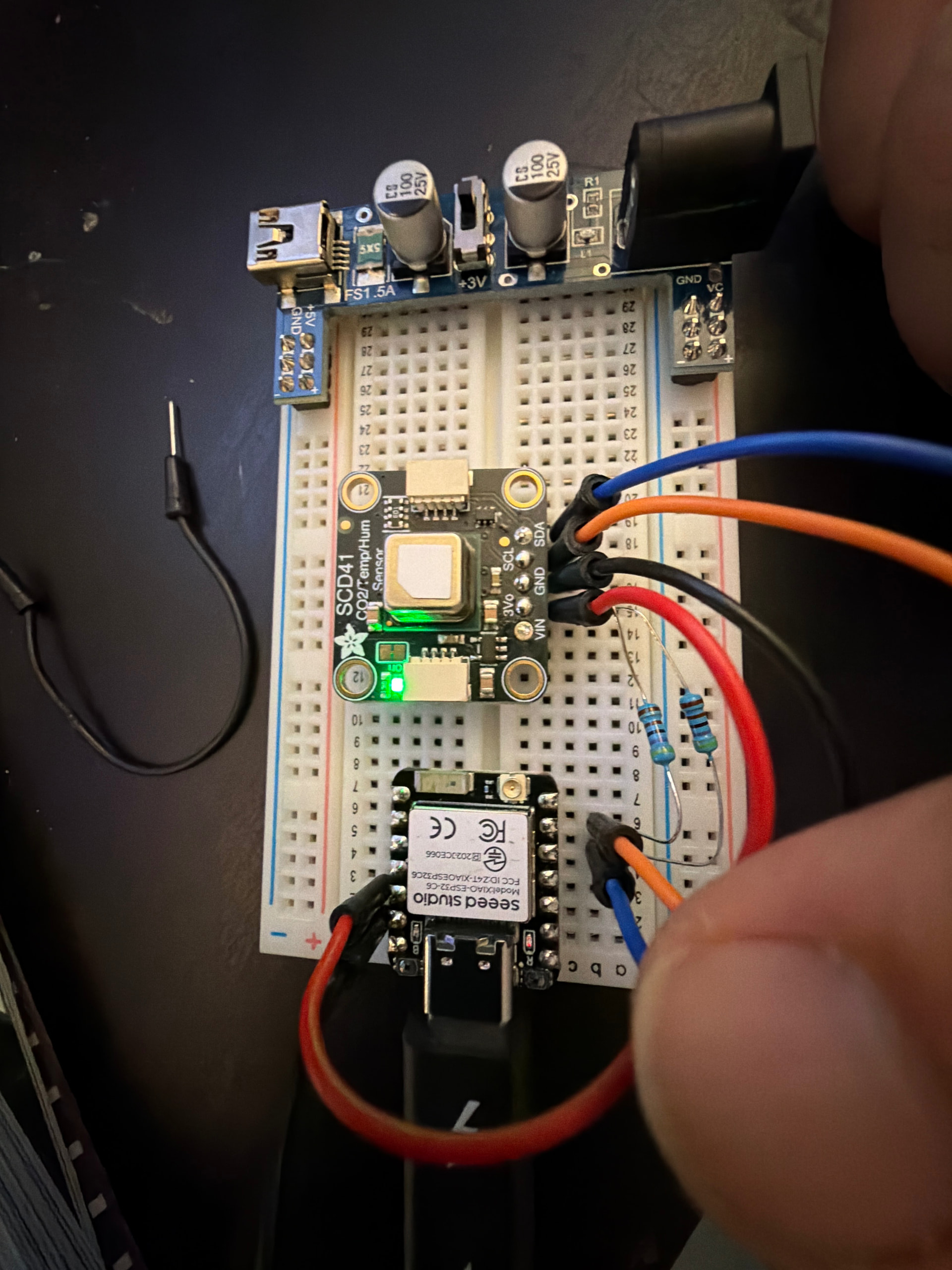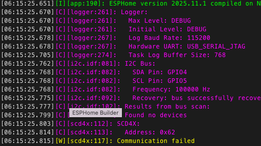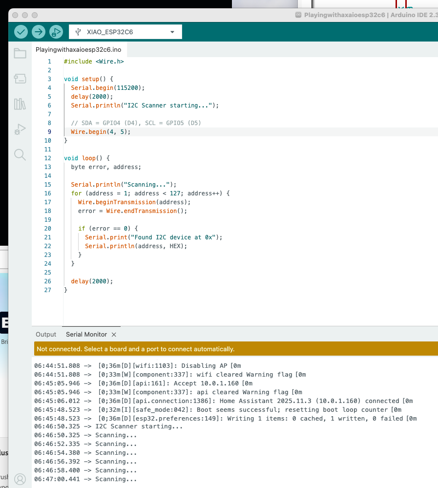Hi all — I’m trying to connect the Seeed Studio XIAO ESP32-C6 to the Adafruit SCD41 (SCD4x) sensor, and the board flashes fine, but I²C scan shows no devices.