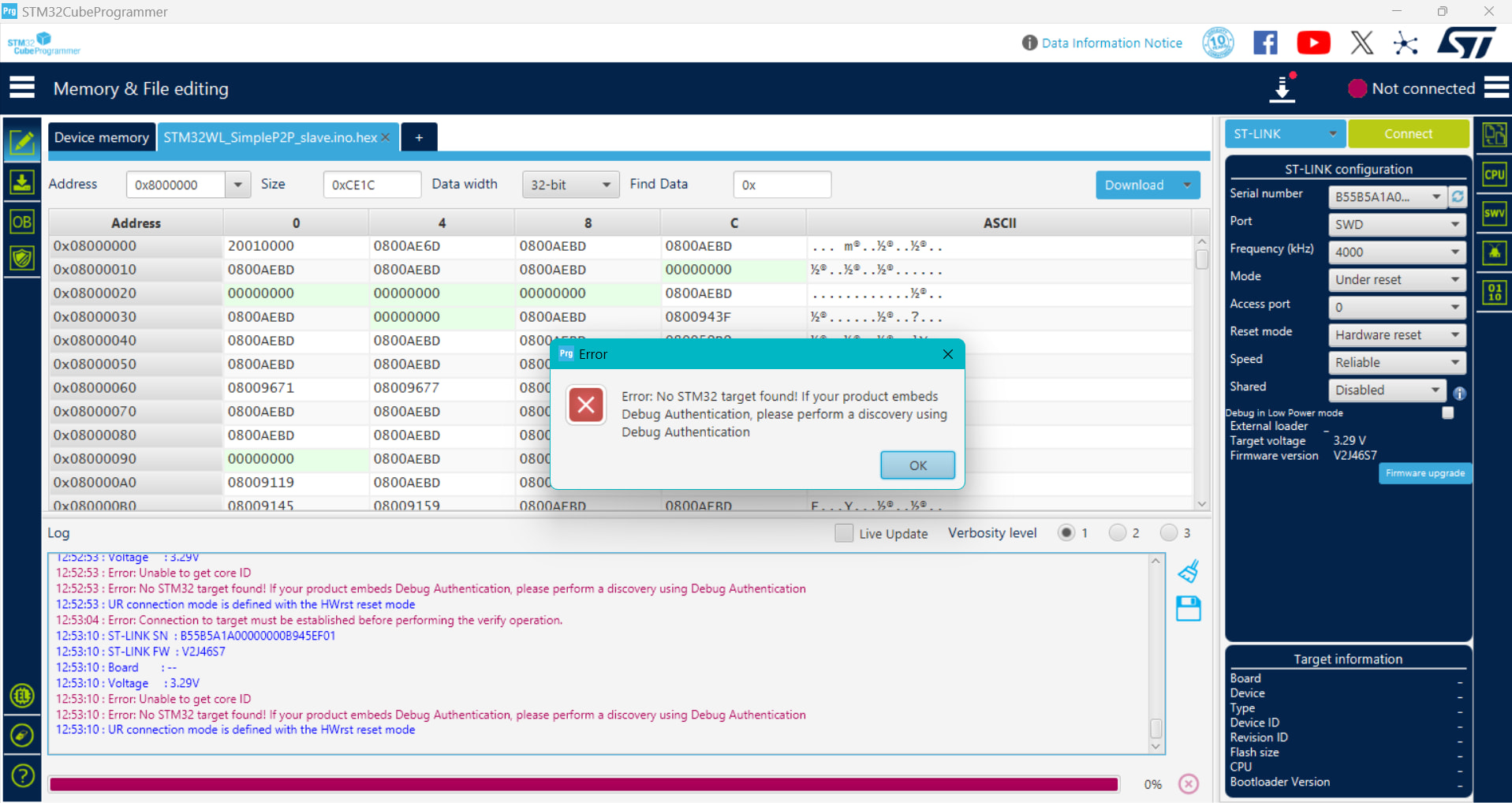 Error: No STM32 target found! If your product embeds Debug Authentication, please perform a discovery using Debug Authentication