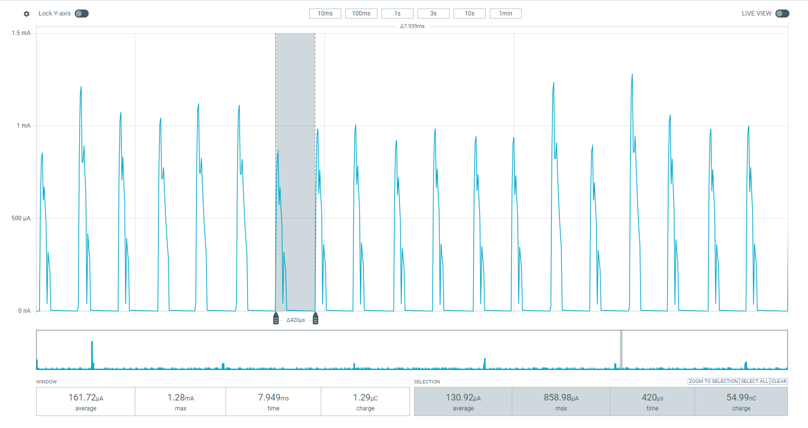 With IMU power enabled and the PDM turned off I also get 150uA power consumption, with power peaks occuring at 2.5kHz.