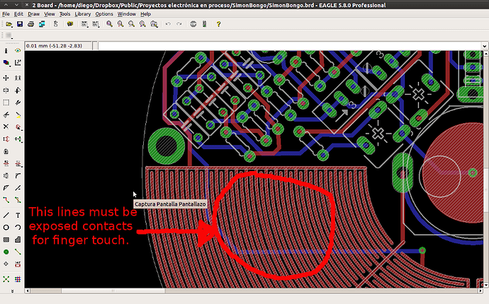 I put my finger contacts on the Top layer and duplicate the same drawing on the T stop layer to be sure this wires will be covered with surface finish and not with solder mask.