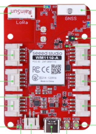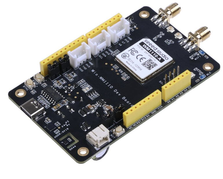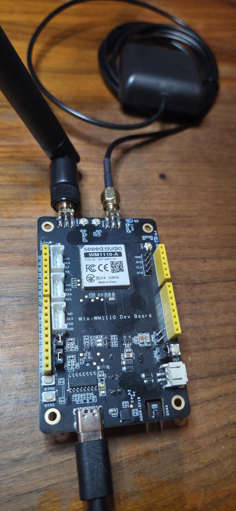Wio-WM1110 Dev Kit (the black board) is intended for LoRaWAN, and there is no firmware for Mestastic or MeshCore currently, though users could create some conceivably. It has antenna connectors for WIFI & LoRa and also a battery connector.