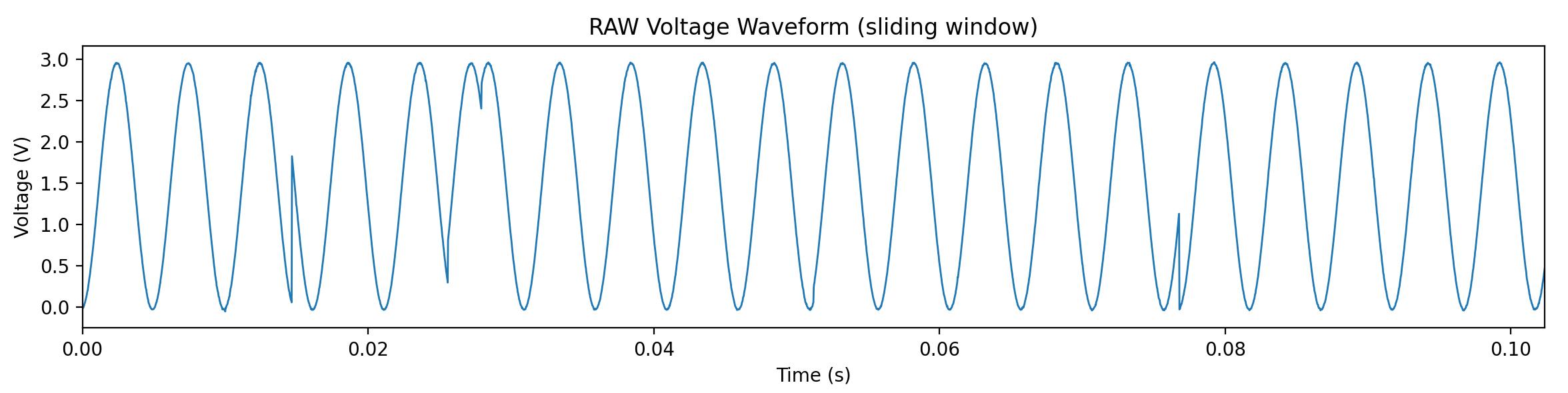 At a nominal sampling rate of 100 kHz with a buffer size of 1024 samples, we see both missing samples within each acquisition frame and dead time between consecutive frames, resulting in visible gaps and phase jumps in the reconstructed waveform.