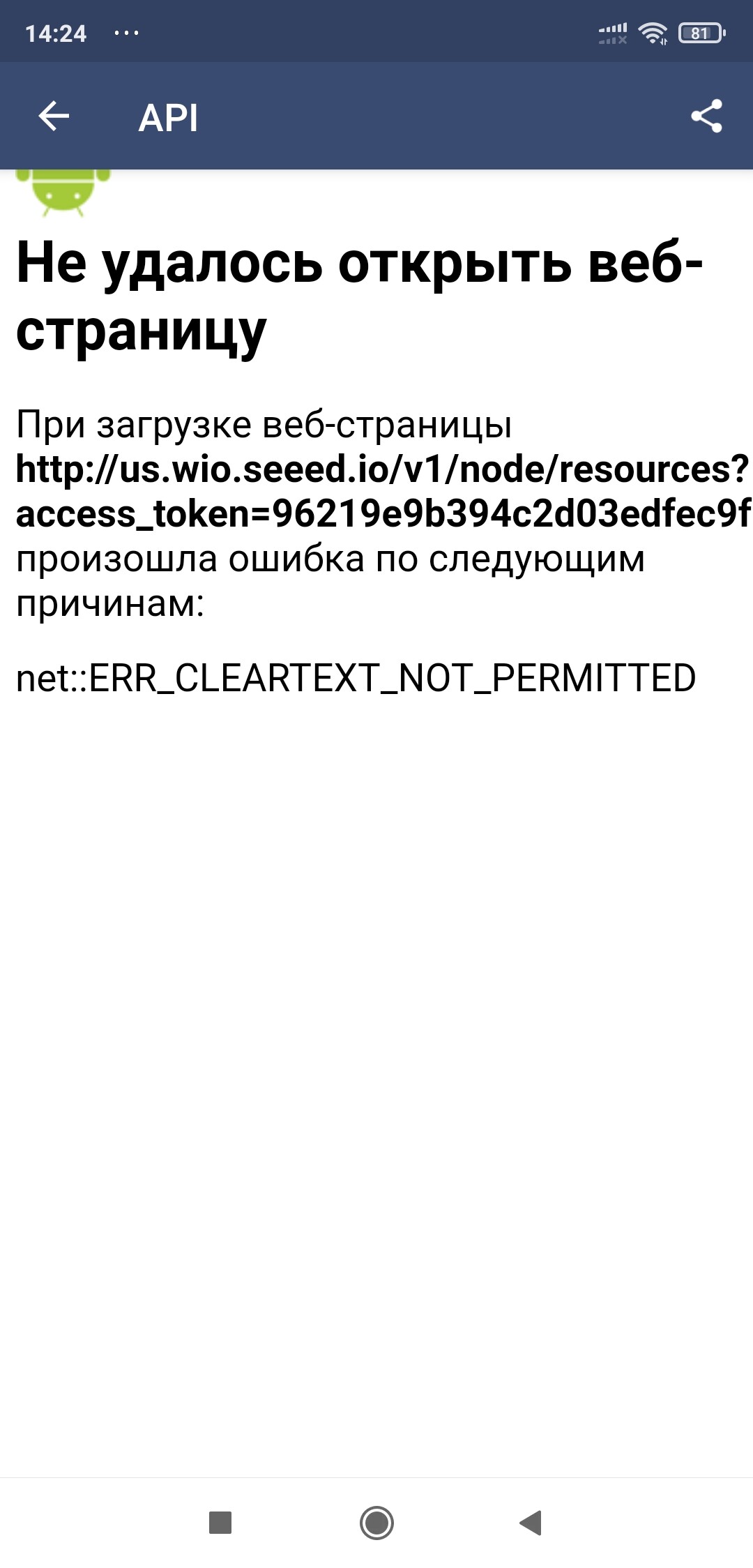 After adding a device into app and downloading FW, when I tap on API menu item I got ERROR see attach.