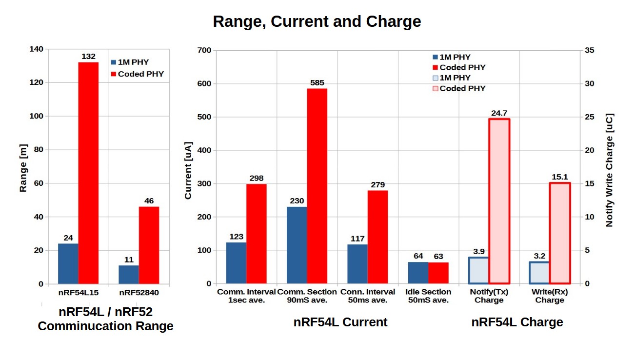 - For both nRF54L and nRF52, the communication range with Coded PHY was more than 4x that of 1M PHY.
